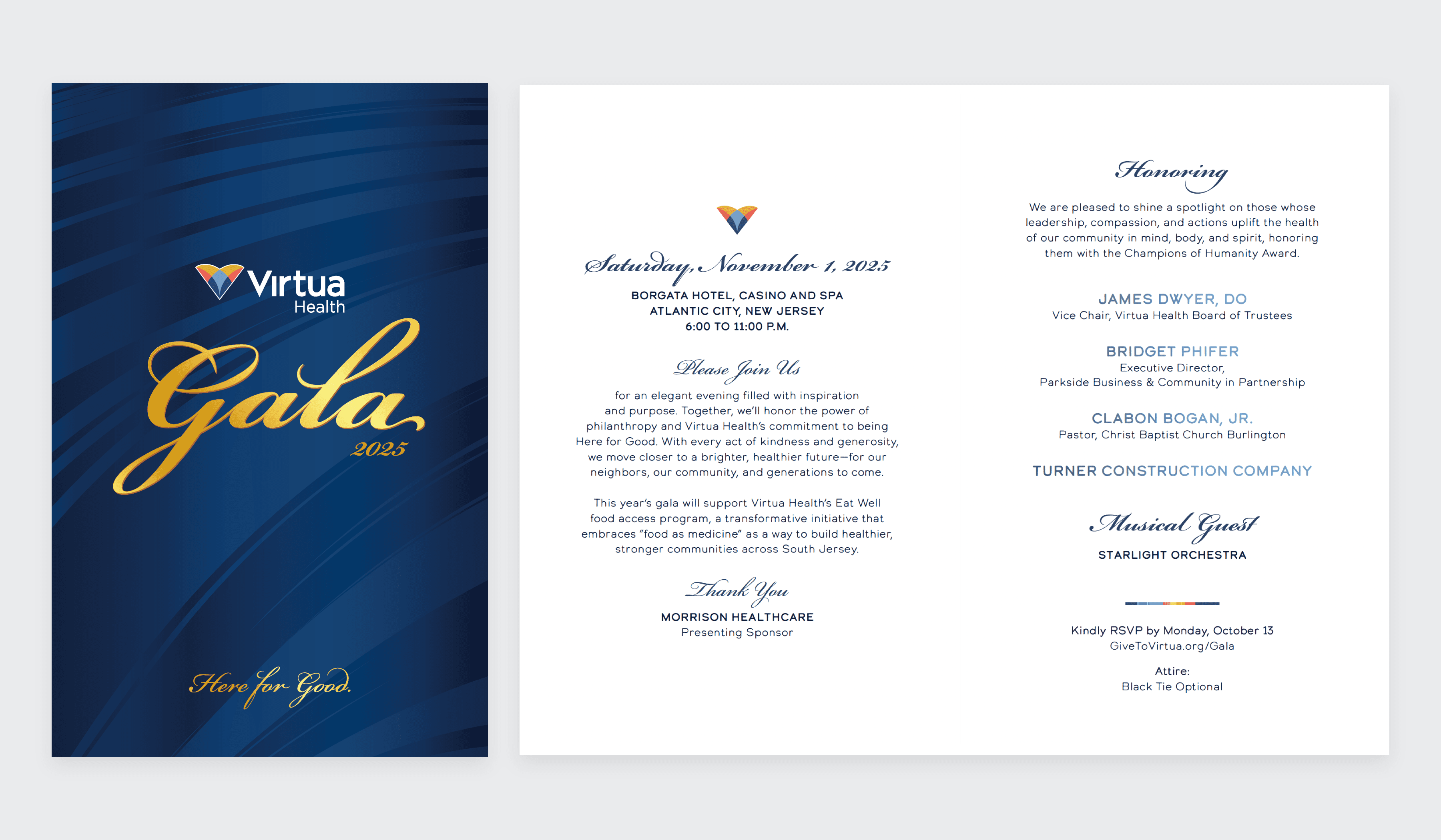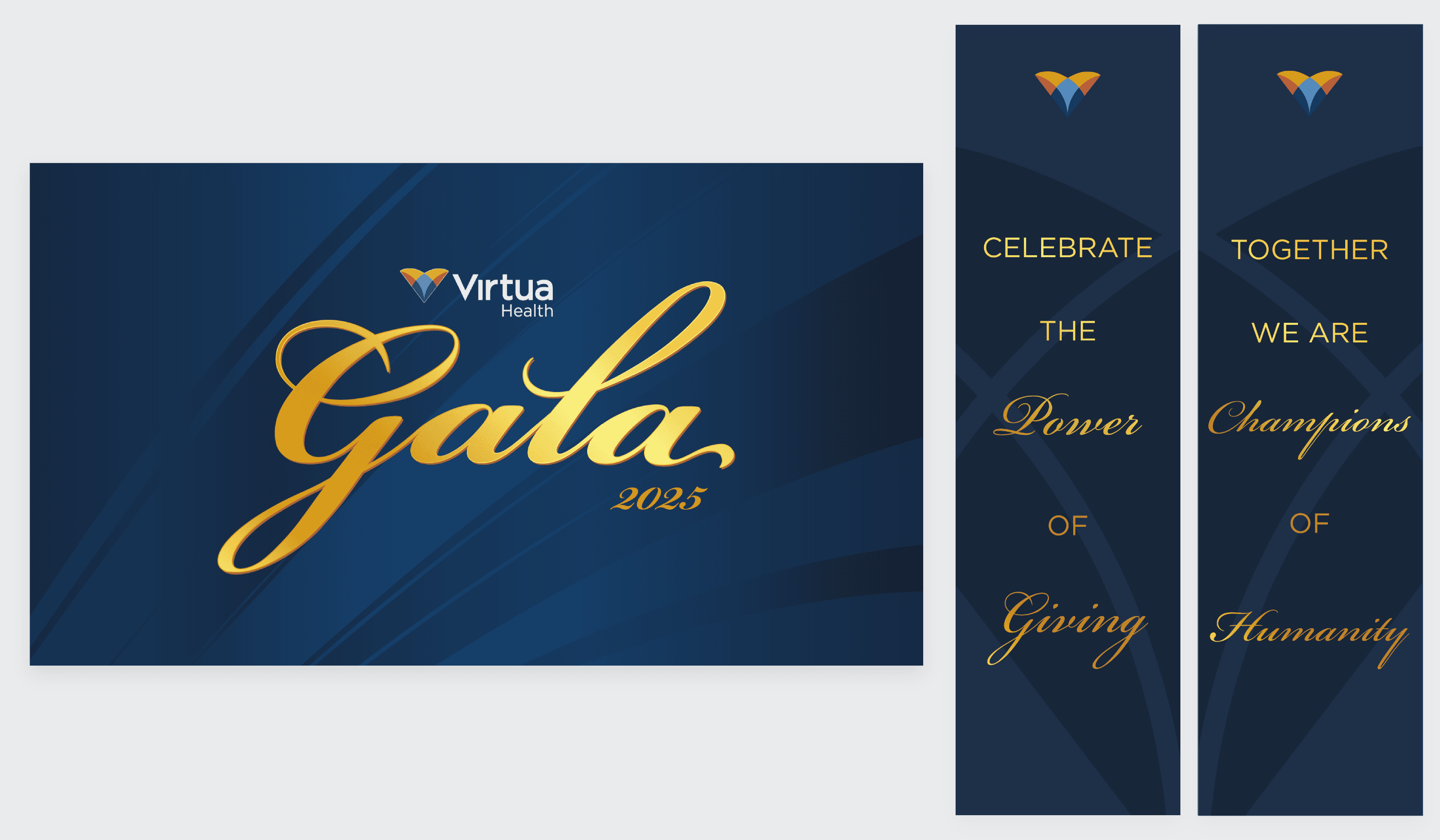 For the 2025 Virtua Health Gala, I led the visual design direction, creating all banners, digital graphics, and event visuals that defined the look and feel of the evening. The gala, held at the Borgata Hotel, Casino & Spa in Atlantic City, brought together community leaders and donors to support Virtua’s Food as Medicine initiative — a program providing access to fresh, healthy foods across South Jersey.